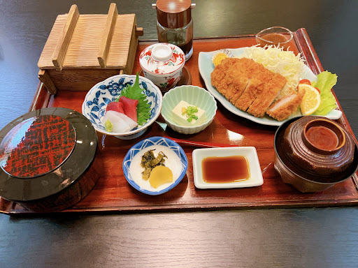 先ず冷たいお茶がいきなり高級感をだしております。 メニューも若干高めでした。食事は和食での定食となります。 今日は1800円ほどの熟成ロースカツ御膳にしました。 ご飯大盛りや一回のお代わりが無料とのこと。 提供は比較的早いです。ご飯大盛りが丁度の量と思いました。 ロースカツは大きくはないが、豪華な内容です。 茶碗蒸し、刺身まで付いてます。味は良かったです。