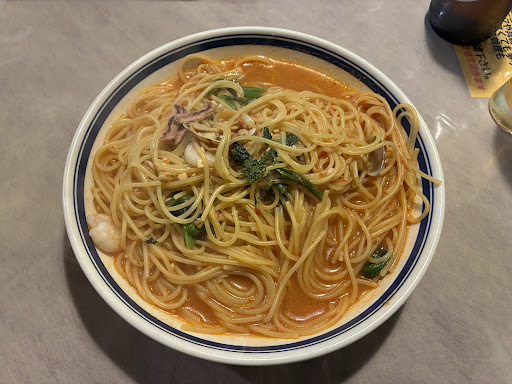 スープパスタの魚介や、揚げなすパスタのなすなどの具が、あまりにも冷凍すぎた。全体的にチープ。が…この価格でこの特盛でこの味は十二分にすごい。東京ならこの量と味のパスタとドリンクとデザートがついたら2500円は取るよなぁ… 赤ちゃん連れのお客さんとかもいて、地元民に愛されてる感じがしました。 味が濃すぎず、油も多くなく、そしてわかりやすい味で、全年齢食べやすいと思います。 トイレは女性は洋式で多少広いですが男性は小上がりの和式でした。 食器も含めて全体的に汚いところはないのですが綺麗とも言い難いのは、建物全体の古さゆえでしょうか。接客が良ければ印象が変わってくると思うんですけど…労働状況悪いんですかね?人見知りなのか真面目なのかわからないですけどもーちょい…私語禁止とかの厳しい感じなんですかね、スタッフさんが明るくない。
