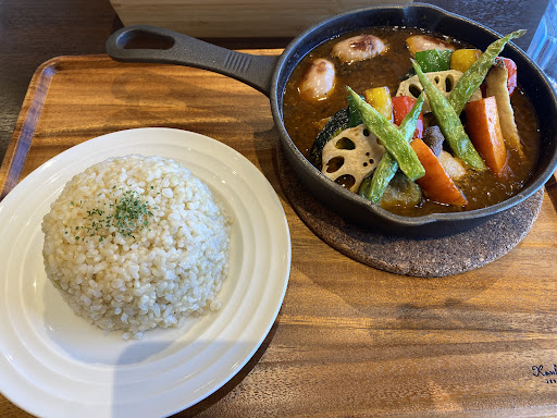 ごはん 白米が玄米、量 カレー スパイシーかクリーミー 量 トッピング 選んでも選ばなくてもよし 基本の焼き野菜は入っているそうです。