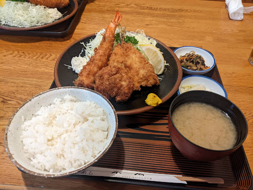 Read more口コミや投稿写真を見て、行きたいと思っていた。お盆休みの土曜日で混んでいるかなと思ったが、お昼時でもすぐに入れてラッキー。 壁には沢山のメニューがあったが、やはり目当てだったミックスフライ定食かなと、ヒレカツ、エビフライ、アジフライの乗った定食を頼んだ。細くきれいに切られた山盛りのキャベツ。厚めのヒレカツ、大きくてしっとりした身のエビフライ、ふわふわのアジフライに、レモン、タルタルソースが付いた大きなお皿。大きなしじみたっぷりの味噌汁。ご飯。切り干し大根とひじきの煮物。白菜の漬け物。全て美味しかった。冷たい麦茶も、いい頃合いで入れてくれたり…忙しくても雰囲気が温かくて、きちんと客を見ている。とにかくメニューの品が多く、どれも美味しそうなので、色々食べてみたいと思った。 駐車場はお店の裏側(バ...