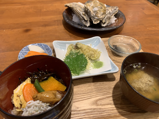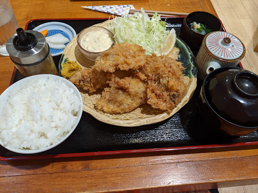 味は1度だけカキフライが神的に美味しかった事があります それ以降は焼きカキもフライも普通です 刺身が要注意でエビと生しらすはいつも生臭いです 味噌汁とご飯美味しいです ドレッシングやキャベツも美味しいです 本日は焼きガキランチでしたが、本日の揚げ物は要注意です 私の場合はいつも天ぷらでカキ1大葉1、メニューのようなフライであった事はありません
