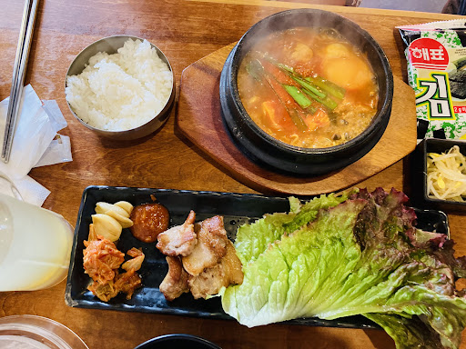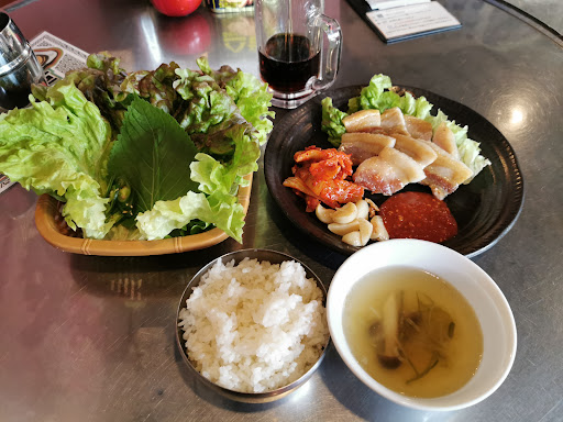 (2023.1.20) 18일에 저녁타임에 혼자 갔었기 때문에, 삼겹살이 2인분부터라, 삼겹살 대신 곱창구이를 먹었는데, 그게 겉바속초 불맛으로 아주 맛있었기 때문에 삼겹살도 맛있을 것같아 20일 런치타임에 재방문했습니다. 삼겹살 정식을 주문했는데, 역시 전문점 답게 겉바속초로 깔끔하게 잘 구워주셨어요. 함께 나온 구운 마늘, 구운 김치가 완전 취향저격이네요. 구운김치가 나올줄이야! 집김치 볶은 것처럼 달근하니 맛있어서, 더 먹고 싶더라구요. 메뉴에 있었으면 추가주문 했을거 같은데, 메뉴에는 없어서 아쉬울정도예요. 상추에 깻잎이랑 고추도 같이 있어서 쌈장에 같이 고기쌈 싸먹었더니, 한국에 온 것같은 착각이 들 정도였네요. 스프의 퀄리티는 조금 아쉬웠지만, 무료 드링크까지 제공해주는, 런치 정식 가격을 생각하면, 대만족입니다.