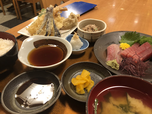 Read moreランチメニューを見て、お昼に入店しました。 ビルの地下1階にある店舗で、少しわかりづらい所にあります。夜は居酒屋、昼はランチ営業をしています。店内は落ち着いた感じで、結構座席も多いですが、隣とのテーブルの距離は比較的ありました。今回は1人だったので、カウンターにとおされました。ランチメニューは常時3〜4ぐらい、他に日替わり定食もあり、定食はご飯、みそ汁、漬物がおかわり無料です。 今回は日替わり定食の刺身定食に惹かれましたが、定番ランチメニューの刺身と天ぷら定食にしました。お茶は粉茶、おしぼりは布タイプでした。 肝心な定食ですが、刺身は漁港も近いこともあり、新鮮なマグロ3切れとサンマ2切れ 刺身はまぉまぁこんな感じかな、天ぷらは海老1尾とアジ2切れ、春菊1枚とナス半分でした。天ぷらは揚げ方が上手だと感じました。個人的には、アジを1切れ鶏天になっていたら良いなぁと思いました。みそ汁は具がワカメのみ。もう少し頑張りましょう。魚を捌いているんだから、アラを入れてもいいんじゃない?コストが掛かるわけじゃないから。 価格も1,200円とリーズナブルなので、ま...
