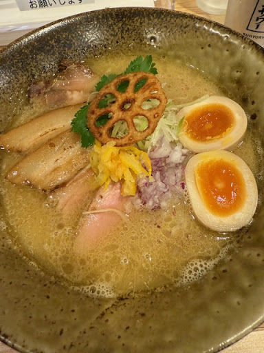 エスプーマ状に仕立て上げられた見るからにコクのありそうなスープに、豪勢に載せられたトッピングが胃袋を刺激してくれます。 スープを一口飲んで胃袋が歓喜して一気に食欲を掻き立てます。 添えられた炙りバラは程よくホロホロで口に入れた途端に良い具合に解けて、肩ロースと鴨ロースはそれぞれの旨みをしっかりと味わえる物でした。 麺もちょうど良い太さでスープと程よく絡み合って、食感・喉ごし共にとてもマッチしているように感じました。 カリカリの蓮根も途中のアクセントに一役買っていて、これまた添えられた柚子が時折程より香って飽きさせない工夫が随所に散りばめられていました。 味玉の半熟具合も絶妙で美味しかったのですが、トッピングを載せ終えてから黒胡椒をかけているのか2/3くらいが味玉にかかっており、ラーメンのアクセントとして弱くなっていたのが惜しかったです。。