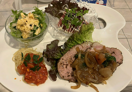 Read more前回、接客で嫌な思いをしたので長いこと行かず、久しぶりにランチタイムに訪れた。月替わりのプレートと炙りローストポークのカレー。やはりどれも美味しい。量もたっぷりでコスパ良すぎ。1人で調理しているようで時間はかかるが、その分いい加減なものは出て来ない。しっとりしたローストポークは厚みも大きさも枚数もたっぷりで満腹になる。今月のプレートのカルパッチョのお刺身の大きいこと。お肉も山盛り。スープもたっぷり(今月はほうれん草と白菜のスープ)、トマトソースの冷製パスタとサラダとご飯(パン)も付いて1,400円はお得。 お料理は大満足なのだが、窓を布で覆ってしまっていて、お店は薄暗い印象。道に面しているわけでもないので、人目もそう気にならないので、あの布が無い方がこざっぱり見えるように思う(個人的な感想)。