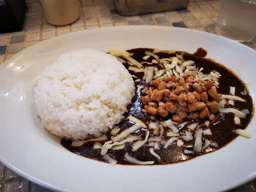 貸し切り状態でしたので待たずに提供♪揚げ物や焼き物を頼まなかったから尚更ですかね。 ルックスは黒みがかったルウにご飯茶碗で固めた様なライスが左側にポンって感じでチーズと納豆がバランスよく盛られてました。