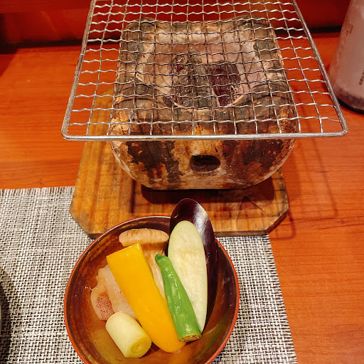 初体験だったのが、お通しが七輪での焼き野菜でした。 ビールのおつまみに「ごぼうの竜田揚げ」納得の味でした。、名物「手羽先唐揚げ」は、外側がカリッとし、中身はジューシーに仕上げ、バランスが素晴らしい一品です。スパイス風味はリピートさせる匠の技、クセになり思わず何本も追加してしまう魅力があります。 お刺身料理にはペアリングの日本酒をお任せしました。宮城県の「日高見 純米吟醸...