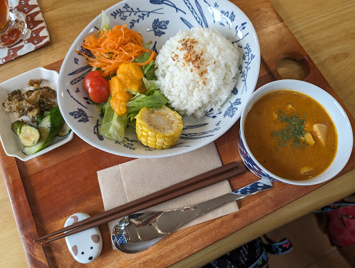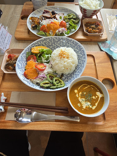 Read more開店と同時に入ればなんとか入れそうです 駐車場はありますが12時ころに来た方は停めるところがなく路駐してました 車で来る方は捕まっても良い覚悟で来た方が良いです ランチは2択で12時には片方売り切れてましたのでランチ自体に人数制限がありそうです 看板犬がまだ若く躾がこれからの様でとても吠えるため 母とうちのマルチは目を丸くしてガクブルになってしまいリラックス所でなく早々に退散しました。テラスならゆっくり出来そうですし畑に囲まれた立地は最高です いただいたカレーは栄養価が高いのにとても柔らかくて喉への負担が少なく、喉に癌のある母は食べやすいと喜んでいました...