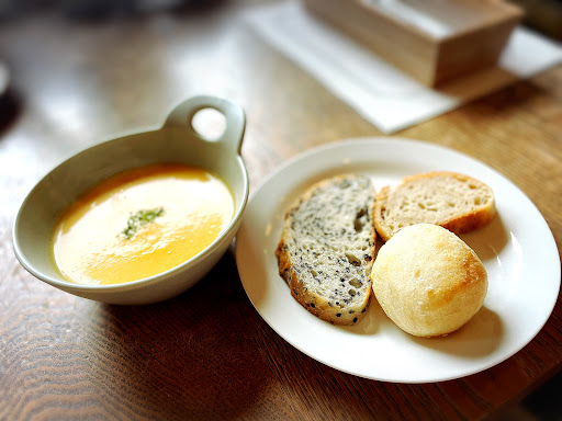 別途で注文した濃厚ポタージュは、お野菜本来の優しさですが、濃厚です。 もっちもちでふんわりした3種類🍞ぱんがすすみます。 ⬆️ エコモ内にて購入できますよ。