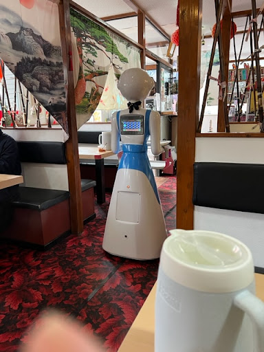 席数が多く、待ち無しで入れて、テーブル席に案内されます。入口の自動ドアが変わっていて、手前に出てくる自動ドアです。