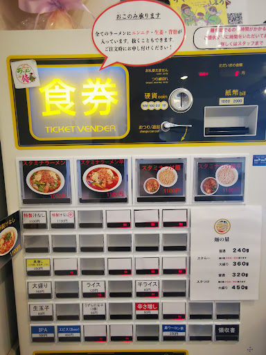 で、入って右手の券売機で選んだのは、スタミナラーメン辛(1.100円)に辛さ増し(50円)とうずらの玉子三個(60円)をポチッとな。