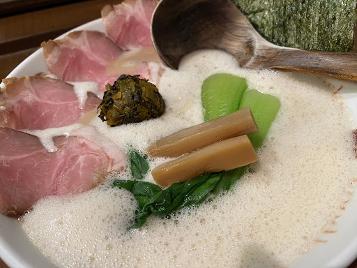 Foamy, clean tonkotsu near Fujisawa Station. Small Bali-style counter shop. Awa chashu ramen looks light but has rich pork taste, no smell. Many toppings on the table so you can change the flavor. Good for eating alone...