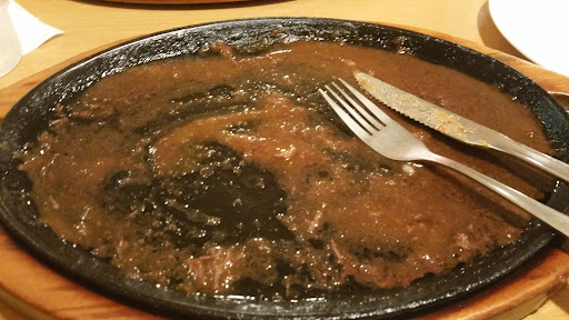 Read more近くのステーキ屋さんに初めて行きました。 家族はヒレステーキ150g、私は人気のジャンボステーキ300gにコーンスープ、普通ライスを注文しました。 間口の狭いお店ですが、奥行きがあり、4人掛け席が3、2人掛け席が2、6人掛け席が1、ありました。人気店らしく、お昼時にはほぼ満席でした。 最初にコーンスープが出され、熱々のスープでとても美味しいでした。 次にステーキとライスが、鉄板の上にV字型のジャンボステーキにソースがタップリ掛けられて、それにジャガイモ、人参、インゲンが添えられでてきました。家族のヒレステーキには、レモン、バターを乗せらていました。 普通ライスは、ファミレスの大盛りライス並みです。ジャンボライスにしなくて良かった。 ステーキはミディアムで頼みました。ステーキを一口、なかなかの歯応えと噛み心地です。家族のヒレステーキは柔らかいようです。 ジャンボステーキは食べ始め半分位でアゴに疲れが感じ始め、ステーキを更に小さくカットしてなんとか、ライスと共に完食しました。 家族はヒレステーキが、柔らかく、満足してました。私は、次はヒレか、サーロインにします。ライスは小ライスに。 他のステーキ屋さんに比べると比較的に価格が安いので満足出来ましたが、家族2人で、5000円弱。回転寿司、フレンチレストランのランチ...