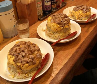 To make it, transfer the cubes of chashu pork topping and fluffy egg omelet to a single serving donburi, then place a normal amount of fried rice on top and squish it into the donburi at the end. Turn it upside down and serve it on a platter to complete the regular serving. For the large and medium portions, only the large portion of fried rice was placed on the plate first, and then the regular portion in the donburi was placed on top.