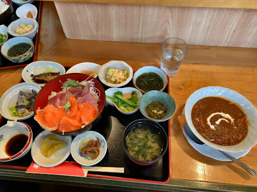 Read moreGW初日の4/29訪問。 「マグロサーモン丼御膳にセットで深浦雪人参ビーフシチューつければ、うちのオススメ全部食べられます✨」とおかみさんから説明いただき、夫婦してそれを注文。 いやー!小鉢も含めて出していただいたもの全部美味しかった! 柔らかくてスンとした旨味のマグロはもちろん、深浦サーモンの甘くとろける舌ざわりが衝撃的。こんな旨いサーモン食べたことない。もちろん臭みなんぞ一切なし。 マグロの皮のポン酢和え(小鉢)なんて初めてお目にかかったし、これがジューシーでさっぱりしててまた衝撃。 ビーフシチューも、雪人参の旨味甘味がスープに溶け出していて、ペロッと食べてしまいました。御膳注文すれば300円でセットにできるって、安すぎるよ😂 小鉢はほとんどが地のものを使っていて、小鯵の佃煮、イカの塩辛、ウドの酢味噌がけ、もずく酢、そうめんわかめ、林檎のコンポートなど。どれもシェフさんの拘りと旨味が詰まってました。