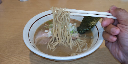 Read more標準より美味しいです。 スープは煮干系の魚粉が多少ザラザラするタイプの濃厚魚介。濃厚でも魚臭さは無くて出汁取りは丁寧。豚骨が合わせてあるらしいが魚介が強くて解りづらい。順番は前後するが、スープを飲みきると底に豚骨の粉が残る。と考えると、店に入った瞬間豚骨を炊いた特徴的な臭みが無いのは凄い。 何れにしろ、確かにホンモノの濃厚なのだけど、魚介も豚骨も臭みが無いのは素晴らしいです。 麺は少し太めで加水率は標準。茹で加減固め。濃厚スープに太めは噛みごたえが有ってよく合う。 チャーシューは豚バラでよく煮込まれたタイプ。大きめの1枚がドンと乗っているが、スープが濃厚過ぎてどんな風味付けなのかよく解らない。 濃厚スープの中にメンマが混ざって居ました。なかなか気付きませんでしたが、濃厚でトロミの中に良い歯ごたえのメンマは変化が有って良い。 中央に刻みネギが多めに盛り付けられている物は、鮮烈なピリ辛で素晴らしい薬味の役割を果たすのだけど。食べ始めから間もなく全体に混ざり始めてしまう。 出来たら別皿で提供して頂いた方が、舌が疲れてきた自分のタイミングで入れる事が出来る。