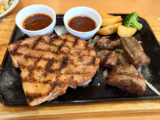 ビーフ100パーセントのハンバーグはあまり美味しくないですし、その上、俵型にしてるため火の通りが悪く、めのまえで半分に切ってくれてミニコンロで焼きながら食べるのですが、 肉柔らかくてボロボロになります。