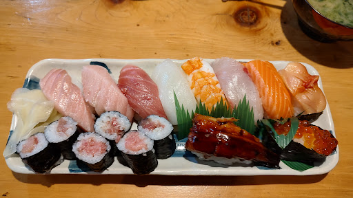 自分が頼んだ特々上寿司ですが 1:握り9貫(大トロ2・中トロ1・タルイカ?1・エビ1・ハマチ1・サーモン1・ウナギ?穴子?1←一月以上経ってるので記憶が曖昧です) 2:軍艦1(イクラ) 3:細巻6(ネギトロ) 4:アオサの味噌汁・ブロッコリーのサラダ・豆煮、(これは連れの海鮮丼にもついてきた)
