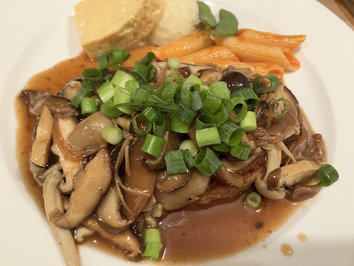 きのこバーグの甘みのあるソース、 ふっくらしたパティ、絶妙な香ばしさのきのこは本当に好きです。
