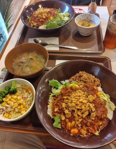 今回は 【牛あいがけタコライス】 【タコライス】 【とろ〜り3種のチーズ】 【サラダ】 【しじみ汁】 を注文。 【牛あいがけタコライス】 チーズ感も野菜感も弱いので追加トッピングにて増量。サラダにはフレンチドレッシングを掛けてからオン・ザ・ライス。おすすめ。 【感想など】 夏季限定商品で前年も販売されていたが今年とは若干内容が違う。年ごとにメニュー内容が変わるので注意。