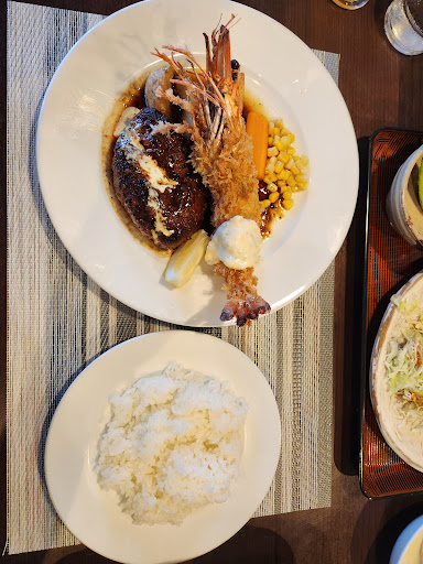 連れからハンバーグを貰う。 柔らかい!少し豚の匂いもあったけど、美味しい。 エビフライはぷりぷり。 ちゃんと噛めればそれぞれの味をもっと楽しめたのに😥
