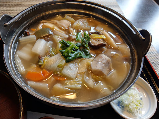 Read more不思議なことですが本当に、煮ぼうとうと洋食のお店です。お店の中は洋食屋さん風でお洒落な作り、メニューも前のページには前菜、カツ、オムライスなど洋食が並びますが、後ろのページに煮ぼうとうがあります。煮ぼうとうは醤油味で、それほど醤油は濃くなく、塩味の味付けです。里芋、人参、きのこなどがたっぷり入っていて、ゆずの香りもあるので、非常にさっぱりした料理で、野菜のボリュームもあり美味しいです。山梨のほうとうと違ってカボチャが入っていないのですが、それは味噌味ではなくて醤油味で、ドロドロしておらずさっぱりしているため、カボチャは合わないのでしょうね。