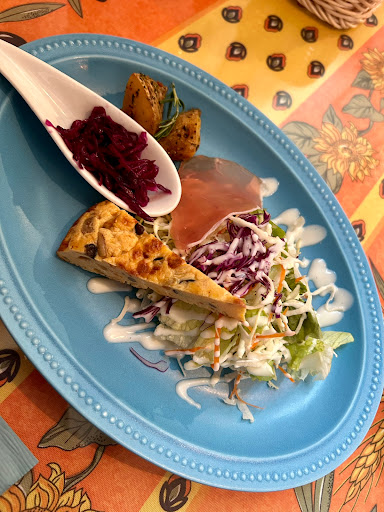 本日のスープはそら豆のスープ 前菜はサラダ、生ハム、オープンオムレツ、紫キャベツのラペ、ジャガイモのハーブ味の美味しいやつ、と6種も!!