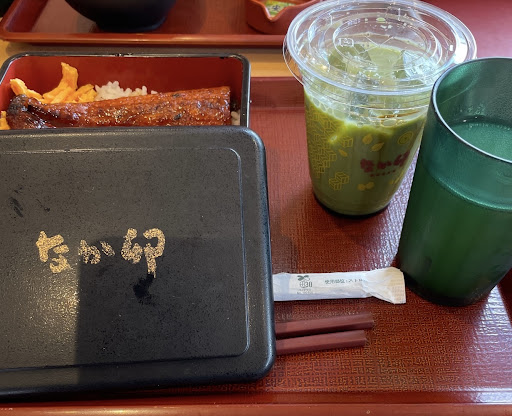 うな重、抹茶ラテ(わらび餅入り)、サーモン玉ねぎ丼に竜田揚げと味噌汁セットを注文 テイクアウトでも美味しく食べられますが、やはり出来たてを店内で頂くと更に美味しい。季節の具材が入ったお味噌汁は身体にしみました
