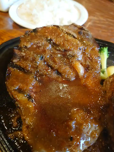 Read moreステーキハウスの佇まいだが、ランチの人気はハンバーグセットにスープとサラダのバイキングがついたものがメインのようでした。 ハンバーグは数種類あり大きさも2種類ありソースが選べるものもありライスかパンも選べる。 ハンバーグ300gにチーズトッピングのセットと小さいハンバーグとステーキのセットを注文。 ハンバーグはジューシーなものでなくしっかりした硬さのハンバーグで肉感はある。 ステーキは値段相応のものでお得感はない。 ハンバーグだけのセットがコスパは良い。 ハンバーグ自体はそこそこ美味いが初めからかかっているソースが塩辛くて残念でした。 ソースは好きなだけかけるように別で出していただきたい。 サラダバイキングはまあまあ種類があって新鮮な野菜でドレッシングも数種類あり美味い。 スープバイキングは3種類とカレーがありライスを頼めばカレーライスがいただけるが自慢するカレーらしいがレトルトで有りがちの味わい。 しかしハンバーグのソースは塩辛いのにスープは3種類全...