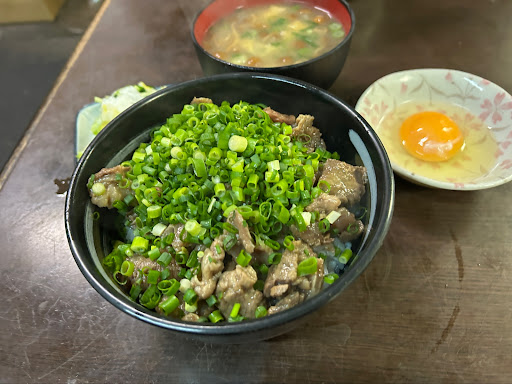 ここのスペシャリテは牛すじ。 牛すじ丼、すじそば、すじうどん。 私は牛すじ丼をオーダー。 完全に柔らかくなるまでどれだけ時間をかけたかわからない牛すじをご飯が隠れるまでぶっかけ、ネギを贅沢に載せた丼は気取らず、しかし威風堂々とテーブルに鎮座。 テーブルにある一味をふりかけ、そして私は生卵の黄身だけを丼にのせ(白身は味噌汁にイン)牛すじを口に運ぶと、、、