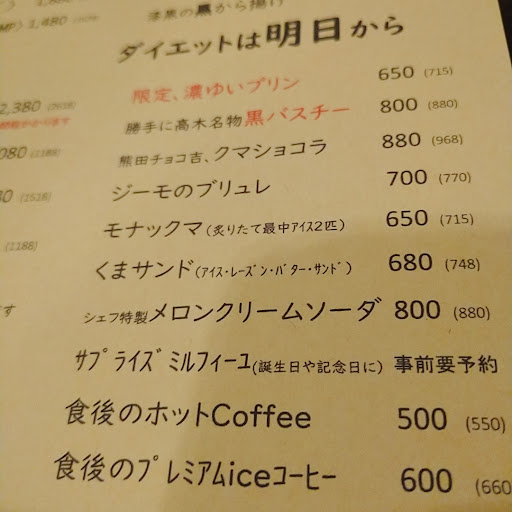 Read more1年前に医大前から、高木の元蕎麦屋さんがあった場所に移転されました。 女性には1杯目のドリンクに熊の形の氷が使われていたり、デザートに熊の形の最中があったり、チーズフォンデュやシカゴピザなどなど、女性好みで映えるメニューが多いです。メニュー名もひと工夫されていて面白いです。 値段はどれもお高めの印象です。店内もバブリーな雰囲気でした。 犬連れの方に別部屋が設けられており、予約制だそうです。 駐車場は何台も停められますが、店の入口近くは道路から奥となり、停めにくいのか皆さん避けている感じでした。そして、その奥の駐車スペース前にお店の方の車が縦列で停められており、それも避けて停めるとなると、避け...