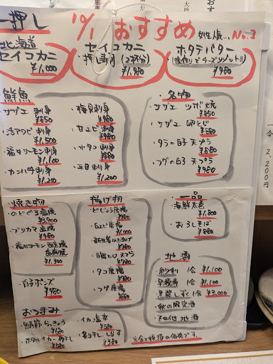 メニューはいろんな種類のお造りやお寿司をはじめ、福井と言えばの越前ガニや水ガニ、汐うにやへしこ、それにのどぐろやぶり、サーモンの西京焼きなどの焼き魚、それにあんこう鍋やおろしそば、お酒も日本酒が充実したラインナップです。