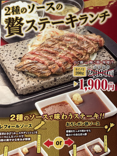 Read more新潟県に本社を置く会社が運営するチェーン店で上信越、東北、北関東、北陸に店舗を展開しているようです。福井県内ではこの店舗の他に、武生にもう一店あるやうです。 1,000円前後で食べられるステーキランチはコスパ抜群で、肉の量120gは一見少なくも感じますが、ランチとしては絶妙な量で、また秘伝の味と記載されたソースもとても美味しく、システム化された接客も完成されたもので、とても満足できました。 当日は祝日だったこともあり、家族連れが殆どで店内は子供の声やなんやらで騒がしかったんですが、私の行ったタイミングが悪かっただけの話ですし、オーダーしてから料理が提供される時間も昼時とほぼ満席な状態を考えれば、かなり早く提供していただき、サービス面においても味においても、とても満足...