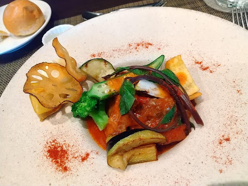 アミューズのキッシュが美味しかったです。 前菜はサーモンと焼き茄子 ビシソワーズ お魚はスズキ パンにアボカドオイルを勧められるんですが、オイルをつけるなら塩も欲しいなあ お肉は鴨肉 付け合せの野菜も大変美味しく、お料理は満足でした。