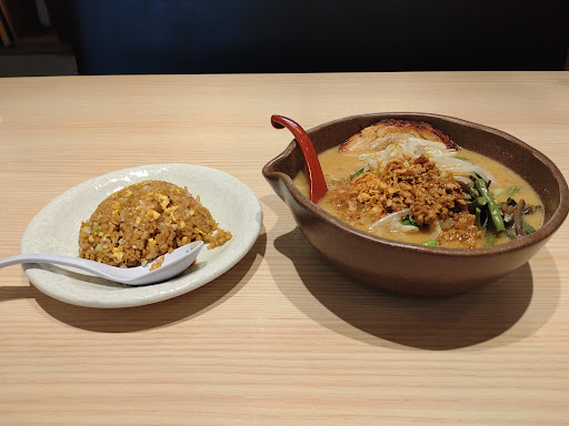 2023/07/27 21時訪問 前回から一週間しか経っていないが、友人に誘われたので行った。 今度の女性スタッフは他のお客への説明に必死で、玄関付近でお待ち下さいと言われたきり全く案内してくれない。 バッシングの済んでいないテーブルがチラホラ合ったがピークを過ぎた店内はかなり空いていた。 オーダーしようと呼んだ時にも他のお客への説明とレジ対応で待たされた。 視野が狭く店内状況の把握、優先順位の判断能力が低い。 やはりこの店の一番の問題点は従業員教育だな。 さて、今回はまだ食べていない九州味噌でAセットを注文。 北海道とは対象的な白味噌ベース、見た目通りの甘さ。 辛さは全く無いがコクで勝負するタイプ、ガツンではなくジワ〜っと押してくる感じ。 赤味噌にも合う麺が更に甘さを強調してくる。 盛り付けがチャーシュー+さつま揚げになったので、北海道や信州より食べ応えがある。 (さつま揚げも甘い) 美味しく仕上がっているが、甘過ぎてスープを飲み干すまでには至らなかった。 しかし三種の味噌で店のバランスがしっかり取れているので、九州味噌の存在意義は大きいと思う。 Aセットの餃子もこの価格にしてはかなり美味しかった。 次回じっくり考察してみる。 餃子用味噌ダレも美味しかった。 餃子に免じて★はギリギリ下げないでおく。 次回は辛味噌だな。