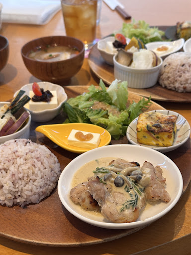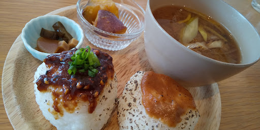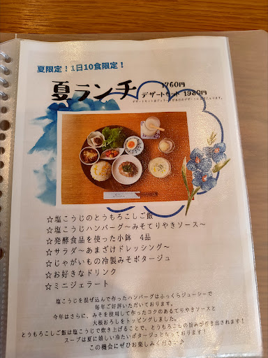 Read more『みそカフェmisola』さんを訪問。ランチは11:00~14:00までとのことで11:00に到着。店舗の駐車場は5台と少なめでしたが、ぎりぎり駐車することができました。すぐ近くにある米五の工場にも4台止められるスペースがるようです。1Fはお味噌に関する商品が販売されており10:00からの営業となっていました。カフェスペースは2Fとなっており、オープンな造りとなっています。(*エレベーターもありました) 今回注文したのは、ハンバーグがメインの夏ランチのデザートセットと塩こうじ唐揚げがメインのみそらlaランチのデザートセットです!注文が完了すると、箸やお手拭きスプーンなどと一緒に小さな器に入った味噌漬けがやってきます。これが美味しいごはんが欲しい笑!そして、しばらく待つとたくさんのおかずとごはん乗った大きな丸いプレートが運ばれてきました。メインもその他のおかずもスープも米五の味噌や麹を使用しており、身体によさそうで味もやさしい味付けです。みそビールもいただきましたが、これまた味噌の風味が程よく美味しかったです。本日のデザートは、ごまみそベイクドチーズケーキでしたが、こちらも風味がよくしっとりで美味しかったです。見た目よりボリュームもあってお腹も膨れました。ごちそうさまでした。お会計もペイペイ、クレジットカードが使用できるので助かります。 帰りに1Fの直営店販売所に立ち寄りましたが、美味しそうな商品が盛りだくさんあり、次回来るときには、保冷バックを持参して色々買ってみたいと思います。 今回は予約なしで直ぐに着座できましたが、カフェでランチを利用する場合、予約した方がいいと感じます。(今回の店員さんおお客さん...