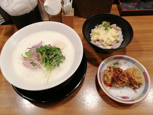 Read more真っ白なスープ⁉️👀という、かなりインパクトがあるビジュアルに惹かれ、初めての訪問でした💕夫が通勤途中にいつもこちらの看板が目に入っていて、前から気になっていたお店だったとのこと😊真っ白いスープ!気になる!と、私のハートにもヒットし、さっそく伺いました☺️♥️お店に着くと、入口を入ってすぐ左手にある券売機で食券を購入するシステムでした🎫👈🏻私は、はじめから決めていた鷄泡白湯ラーメン🍜(真っ白スープ)をチョイス✋🏻夫は煮干し中華そばをオーダーしました✨席でスタッフの方に食券を渡し、醤油or塩かと聞かれたので、オススメと言われた「塩」を頼みました😌出てくるまでの時間もワクワクです🥰ラーメンが運ばれてくると、泡白湯と言うだけあって白スープの表面は泡泡泡になってます👀💓スープを飲むと、泡の口当たりが優しくて、まろやか〜なスープの味が口に広がります✨麺も細くて美味しい😋一緒に頼んだ唐揚げもジューシーで、皮もパリッパリで◎🙆🏻♀️人気No.1のラーメンということで、はじめての方には鷄泡白湯ラーメンはオススメです😄...