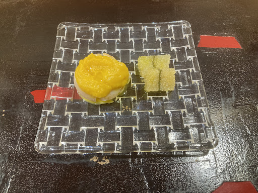 The course began with a delicate Chawanmushi topped with bright green okra—a refreshing palate opener. The foie gras sandwich, playfully presented and accompanied by a light tempura, balanced richness with brightness. A dish of marinated fish with mustard and pickles followed—bold yet refined.