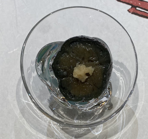 お通しは、ナス。器が硝子製でとても涼しそう。味が染みていて美味しい。