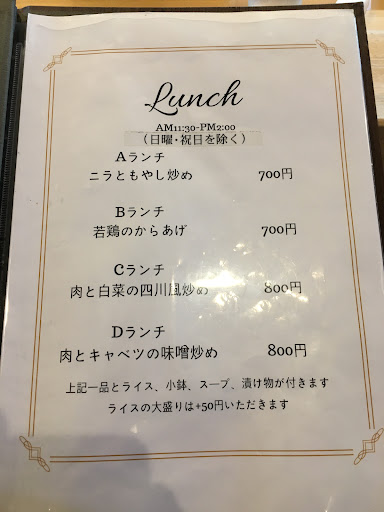 Read more平日ランチで訪問しました。頼んだのはDランチ(回鍋肉セット)です。一人だったのでカウンター席に案内されたのですが、厨房が見える席はワクワクしますよね。自分が頼んだものじゃなくても出来上がる様子を見てるのは楽しいですし、店員さんがテキパキ動いてる姿も見てて気持ちいいです。 料理についても濃いめの味付けでご飯がとても進みます。それを見越してかデフォでご飯が大盛りなのも嬉しい。逆にいうと女性が頼むには結構きついと思いますが。金額は少し前より値上がりされてましたが、このご時世ですし仕方ないでしょう。寧ろこのボリュームで1,000円でお釣りが来ることを喜びましょう。 惜しむらくはこのお店、平日しか営業してないことです。平日仕事の身としてはなかな...