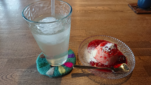 クリームスープはカレー風味でしめじがどっさり入っていたし、こんにゃくとちくわの炒めも旨かった(^^) lunch後は、ゆずジュースと特製白プリンのいちご...