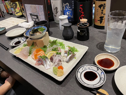 まず、お酒とお刺身6種盛り注文。 お酒はすぐに出て来ましたが、お刺身がくるまで30分も待ちました。 正直、自分のオーダー忘れられてるのでは?と思いました。 お刺身食べながらお酒を飲みたかったのですが、お刺身がきた頃にはもうお酒の氷とけまくりで薄くなってました。