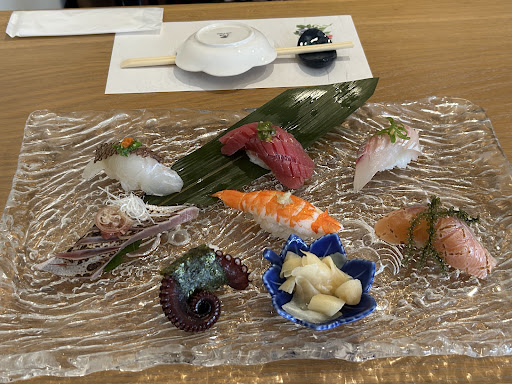 お昼のコース 3,300円⭕️ 握り7貫、細巻、いなり他。 アトランティックサーモン、シマアジ、五島の本鮪赤身、なんとか鯛⁈、やいとかつお、水タコ、海老。