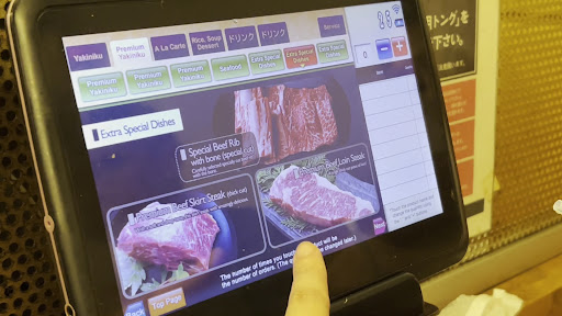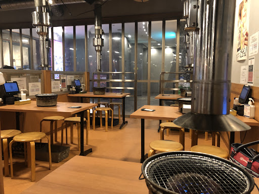 Busy, all-you-can-eat grill with meat & side dishes cooked at the table in industrial surrounds.