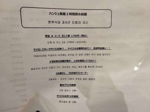 Read more今回は薬院大通駅そばにある韓国料理のお店ハンジュ食堂さんへ。お店は地下にあるので一瞬わかりづらいですが、ビルもとてもきれいです。お店は個室1席、テーブル席が4人掛け2つと2人がけ2つに小上がり席が2席ありました。新しくできたお店のようで内装はとても綺麗でおしゃれです。ランチタイムに伺いました。添付の写真通りランチメニューもかなり豊富です。チェユク定食をチョイスしました。メインの料理にサラダと小鉢が3種類、スープが付いています。牛肉と野菜を辛味噌で炒めたようなお料理でしたが、これがめちゃくちゃおいしかったです。しかもお肉もがっつり入っていてボリュームたっぷり。ご飯もおかわり無料のようでおかわりしちゃいました。お腹いっぱいになりました。メニューが豊富なので次は違うメニューを試したいと思います。 トイレも行きましたがとてもきれいに保たれていて清潔感があり清掃も行き届いてました。