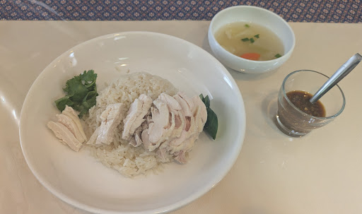 今回注文したのは、「カオマンガイ(950円)」※2025年5月15日現在。 しっかり茹で上がって噛み応えがありつつもしっとり柔らかな鶏もも肉は、何もつけなくてもいいくらいシンプルに美味。 ほんのり茶色く染まったジャスミンライスは鶏の出汁や脂を存分に吸いこんでおり、噛むごとに奥深い滋味が滲み出てきます。 鶏肉だけではなく、骨も煮込んでさらに旨味を抽出したスープを使用しているのでは?と思いました。 これだけでも十分おいしいのですが、生にんにくと唐辛子がガツンと効いたキレのある塩気のナンプラーダレをかけると味が一気に引き締まり、おかず感がさらに増してスプーンが止まらなくなります。 パクチーやきゅうりの浅漬けの付け合わせも、合間合間で爽やかなアクセントをプラスしており、相性ぴったりでした。