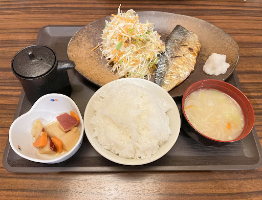 定食の塩鯖は皮がパリッと、ご飯が進む少し濃いめの味付けです。2歳の子どもには、皮をとって身をごはんに混ぜて食べさせると黙々と食べます。今日の副菜は切干大根でした。今日もツヤツヤご飯、おいしかったです。