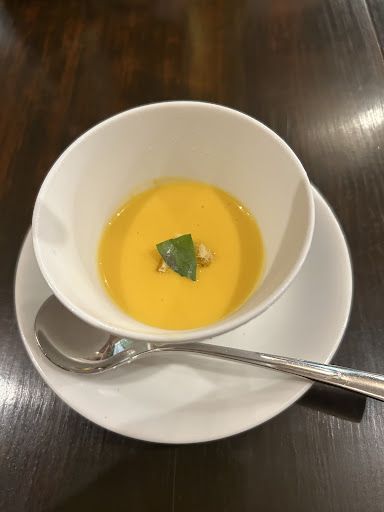 2023.05.27 いつもは週末のご褒美ランチに通ってるヴェルドゥーラさんへ今回は平日ランチでお邪魔しました。 なんと‼︎平日も開店すぐに満席になり賑わってました。予約しててよかった〜!黄色パプリカのポタージュ初めての味で美味しい。なんだろ〜後からくる奥深い旨みがクセになる味。隠し味的な物が⁇気になるな〜。手作りパンも香ばしくてパクパク食べてしまいます。パスタソースにつけて食べたいから半分残しときます。前菜はカンパチのカルパッチョ、ピンチョス、パテドカンパーニュどれも丁寧に仕込みがされてる様子です。ピンチョスの豚肉が噛みしめるほど旨みがジュワッと出てくる逸品。ムリだろうけど家で作りたい笑パスタは定番のエビとキノコのトマトクリームで。生パスタなので麺の美味しさがソースの美味しさを倍増させます。デザートの抹茶のテリーヌも濃い抹茶味で上品な甘さで◎。飲み物もついてて大満足でした。お会計時次回にグループみんなが平日ランチメニューのセット注文で使える『¥100引きになるクーポン』までもらえてビックリ‼︎平日のランチお得過ぎだわ〜こちらの内容で¥1650(税込)。最強だわ。 また平日休みになったら是非利用しなきゃです。 クーポン忘れずに持ってお邪魔します。 ごちそうさまでした‼︎