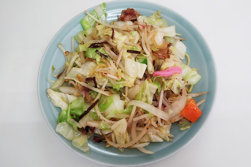 皿うどん750円。 福岡で『皿うどん』と言えば、太麺焼きそばのようなスタイルが普通です。 餡がかかった揚げ麺スタイルの皿うどんは、こちらでは“焼きそば”の名称になっています。 汁気はほぼなく、味は塩やきそばに近い感じであっさりしてます。