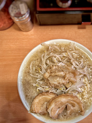 お帰りくまジロー。 リアルな二郎系も進出し、インスパイアもかなり増えてきちゃいるけれど、くまジローのクオリティはかなり好きだったんよね。 今回は券売機が別メニューと併用だったこともあり、オーダーを取る若い子との意思疎通に若干の時間がかかったけれど無事オーダーが通り一安心。 ヤサイマシで後は普通。 しばらく待ってお待ちとやって来た。 どんッ!そうそうコレコレ! 先ずはヤサイの山から喰い崩して地ならし。 ヤサイはもやしとキャベツが9.5:0.5 の黄金比。 適度にしんなり、青臭さも全く無くジャストな茹で加減。 ここでスープを一口。 非乳化の醤油スープは出汁感というより旨味が二郎チック。 ちょい酸味を感じ、バチッと効いた醤油ダレ、ここに刻みニンニクが加わり、ん〜美味いね(^^) 頃合いをみて天地返し。 合わさる麺は平打ちの太麺。 ツルッと滑らかな麺質で、小麦がギチッと詰まった感じ。 スープの馴染みは悪くないんだけれど、もうちょいゴワついた荒っぽさがあればもっとシックリくるんだけどなぁと前回から思っていたりもする。 とはいえ、トータルではけっこう満足。 今回はいつまで啜れるんかな?